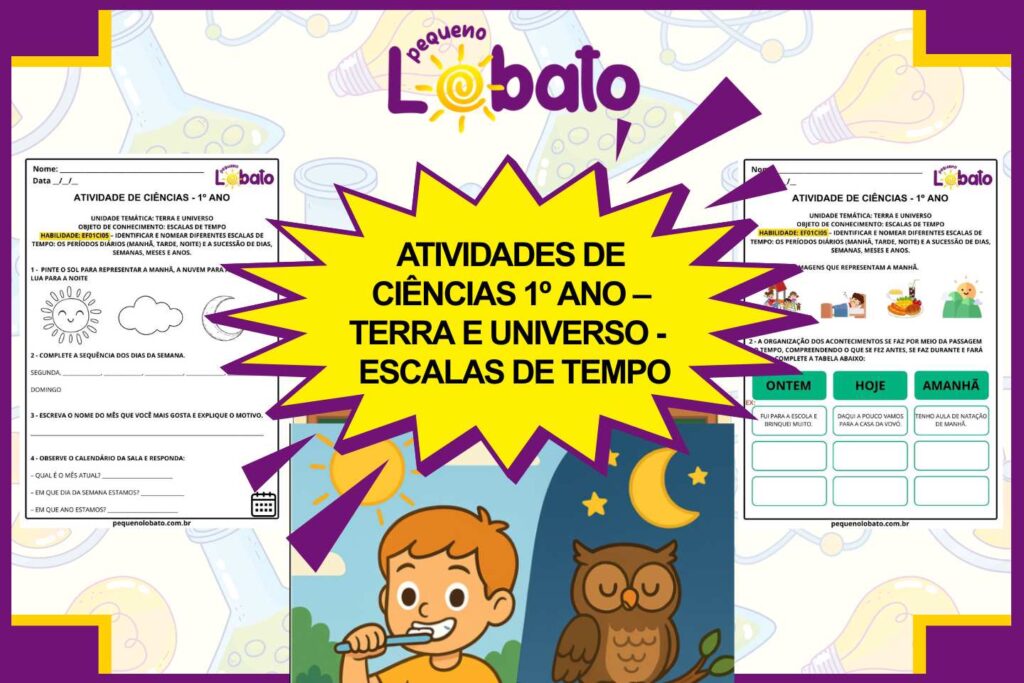 Logo abaixo, você encontrará atividades de Ciências para o 1º ano que exploram de forma lúdica, divertida e significativa as escalas de tempo, ajudando os alunos a compreenderem noções como manhã, tarde e noite; ontem, hoje e amanhã; e a sequência dos dias da semana.