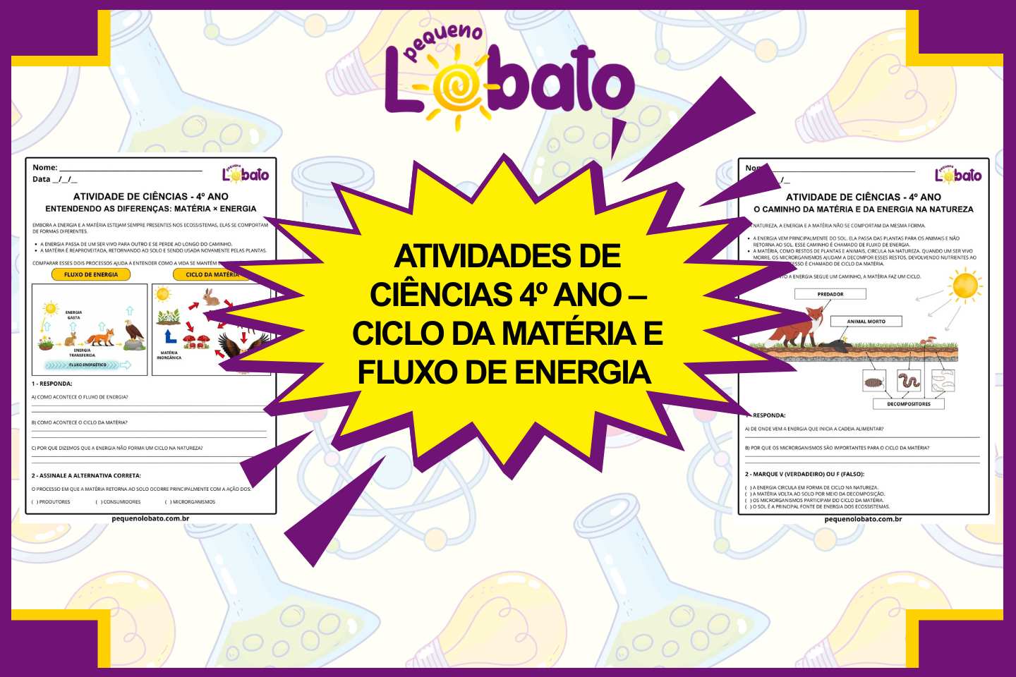 Logo abaixo, você encontrará atividades de Ciências pensadas especialmente para o 4º ano do Ensino Fundamental, com foco no ciclo da matéria e no fluxo de energia nos ecossistemas.